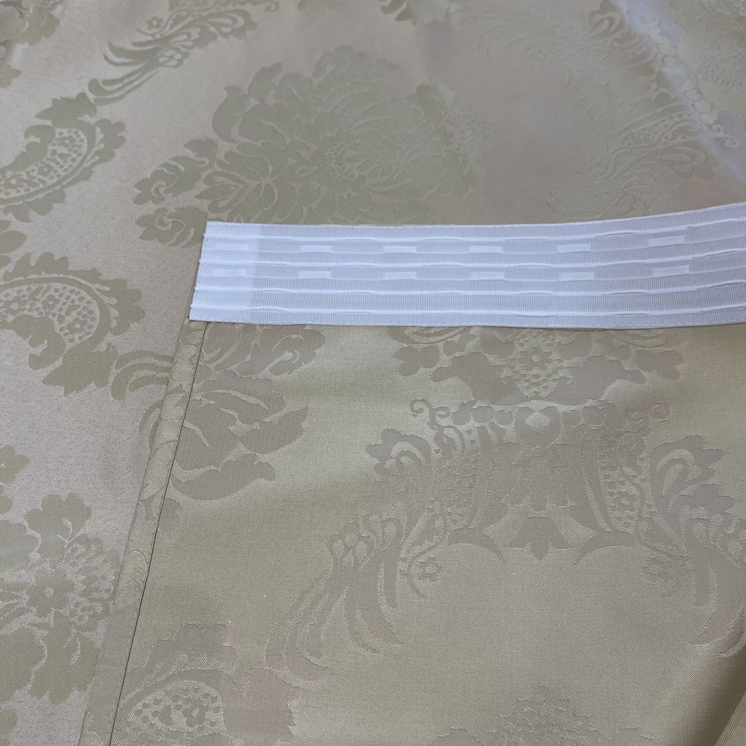 Верх штор обработан шторной тесьмой шириной 6см с двумя рядами петель. Подгиб низа 10см.