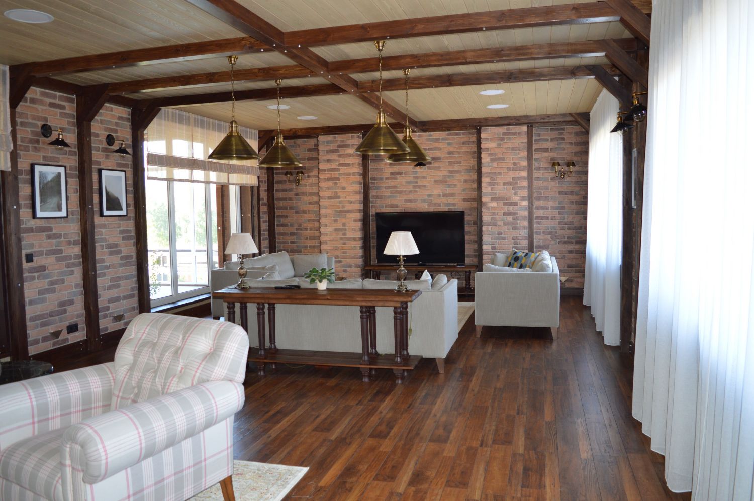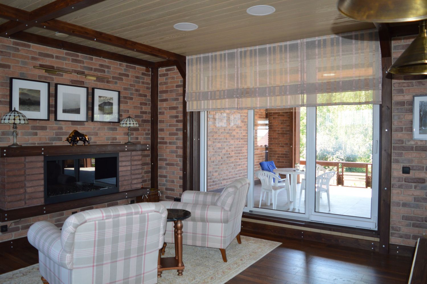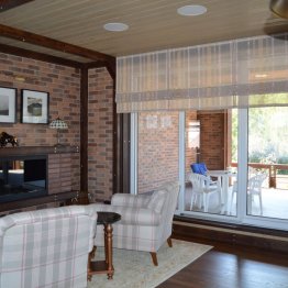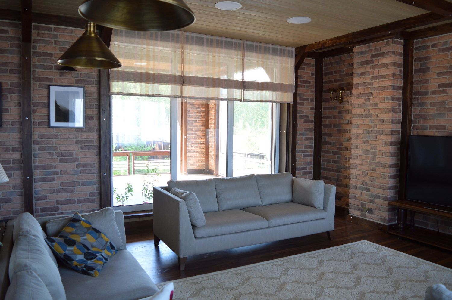 Гостиная в стиле шале. Окна с роскошным видом на лес чуть прикрыты римскими шторами, которые в данном оформлении несут только декоративную функцию.